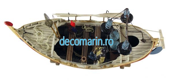 barca de pescuit din lemn pictata manual, inclusiv piese de detaliu in interior, suport din lemn