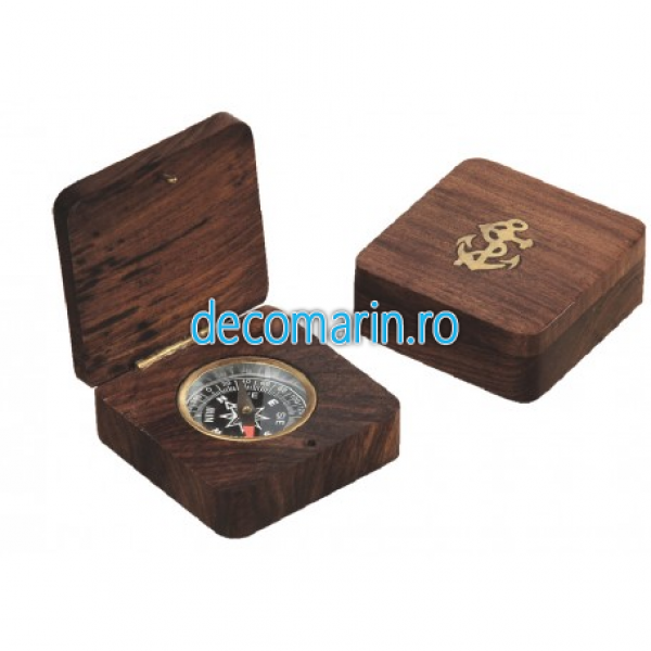 busola din alama cu cadran montat in cutie din lemn de trandafir
