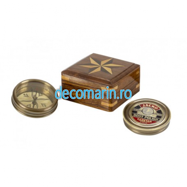 busola din alama cu capac antichizat si cutie din lemn de trandafir