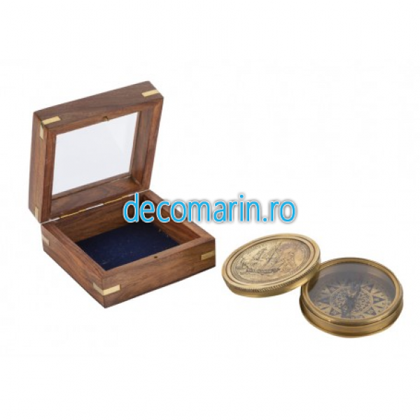 busola din alama antichizata, capac decorat cu galion si cutie din lemn/sticla