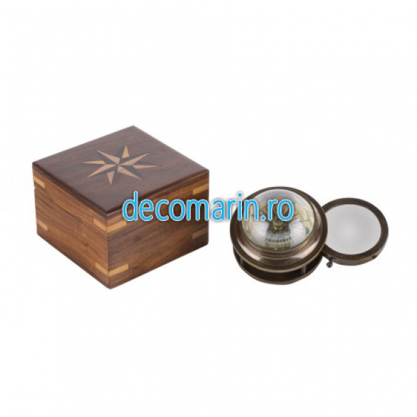 busola din alama antichizata, model cu lupa , cutie din lemn decorata cu roza vanturilor