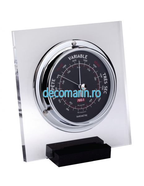 barometru din alama nichelata cu suport din plexiglas si baza de lemn