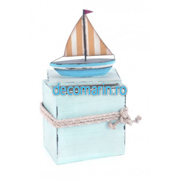 cutie marina din lemn lucrata manual, capac cu barca din lemn si vele metalice