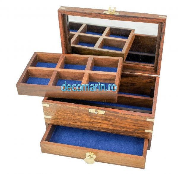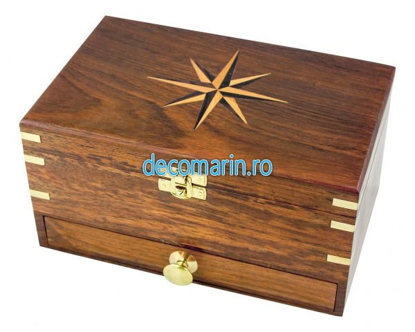 cutie de bijuterii din lemn cu oglinda in interiorul capacului, sertar culisant, model cu roza vanturilor