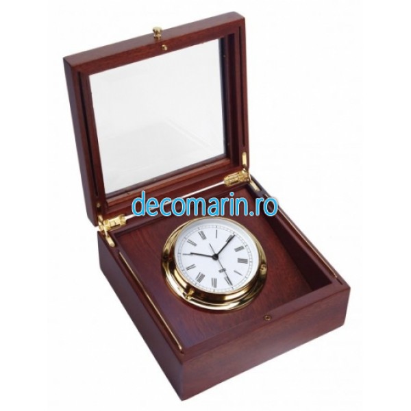 ceas cu cronometru de precizie in cutie din mahon cu capac din cristal si elemente de alama suflate cu aur fin