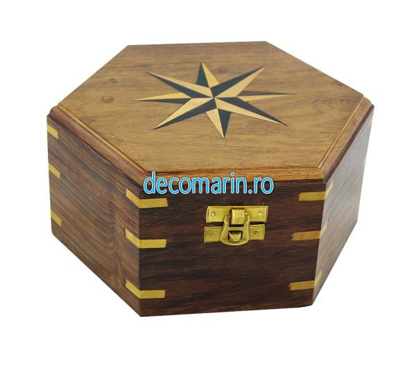 caseta hexagonala cu capac intarsiat, model cu Roza Vanturilor, balama si insertii din alama