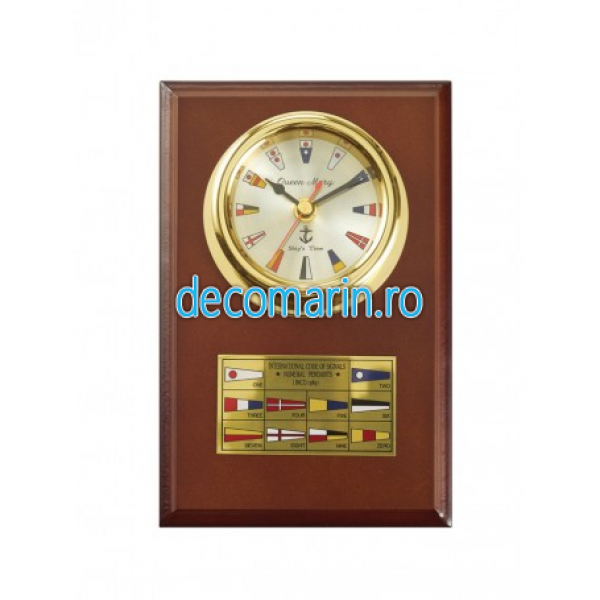 ceas nautic din alama decorat cu steaguri marine internationale in suport din lemn lacuit