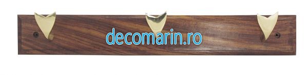 cuier mural din alama pe suport din lemn, model cu 3 agatatori tip coada de balena