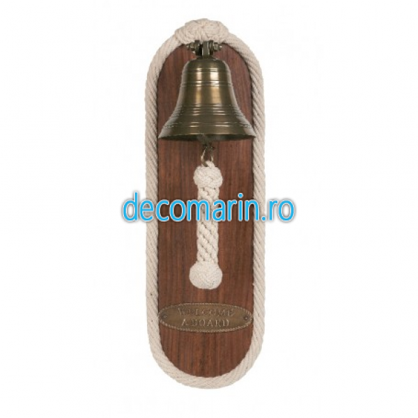 clopot din alama pe suport din lemn masiv inscriptionat Welcome Aboard