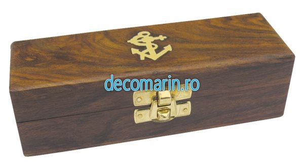 caseta din lemn cu dispozitiv de blocare din alama,capac cu ancora gravata din alama, interior cu catifea albastra