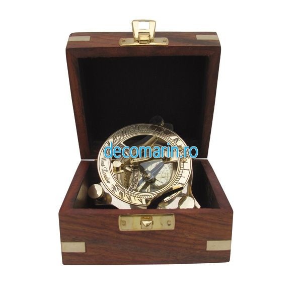 busola cu incrustatii din alama si dispozitiv de blocare in cutie de lemn si interior din catifea