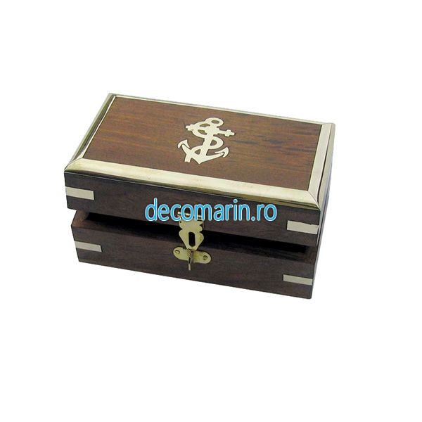 caseta din lemn cu insertii si inchidere de alama,capac cu ancora gravata