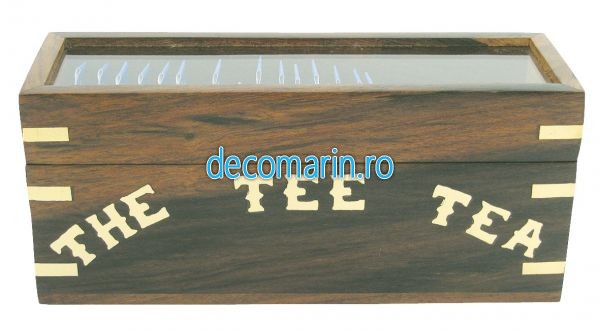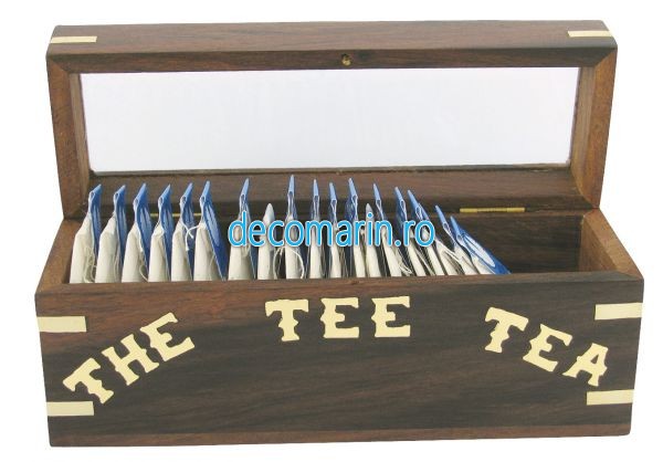 caseta/cutie pentru ceaiuri pliculete din lemn cu insertii din alama,capac din sticla