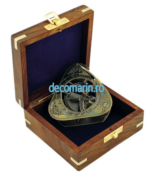 busola cu cadran solar din alama antichizata in cutie din lemn/alama