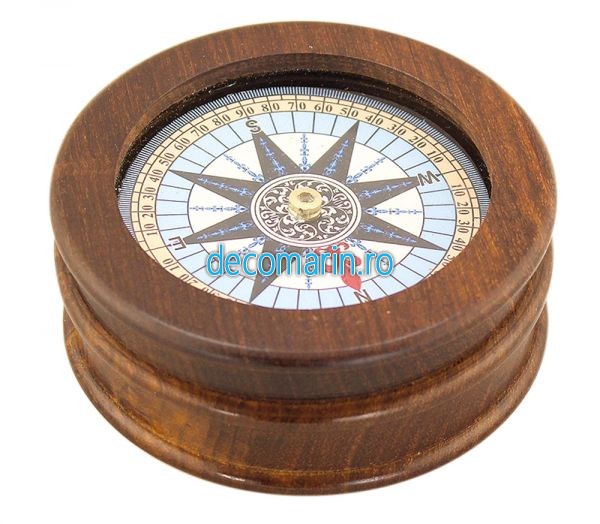 busola in suport din lemn si capac din sticla, cadran cu roza vanturilor