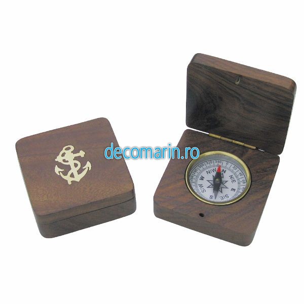 busola fixa din alama, cadran alb, cutie de lemn si capac gravat cu ancora
