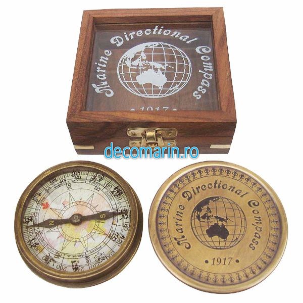 busola cu capac din alama,cutie din lemn cu capac de sticla si decor cu glob pamantesc