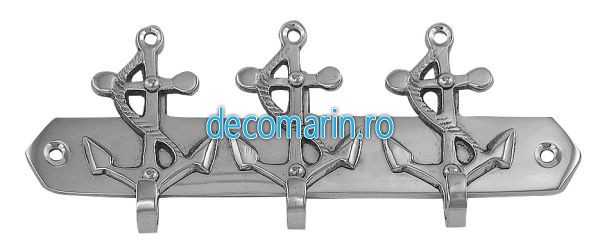 cuier mural pentru chei cu tema marina, model cu 3 agatatori tip ancora, varianta din alama nichelata