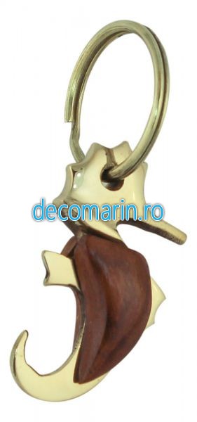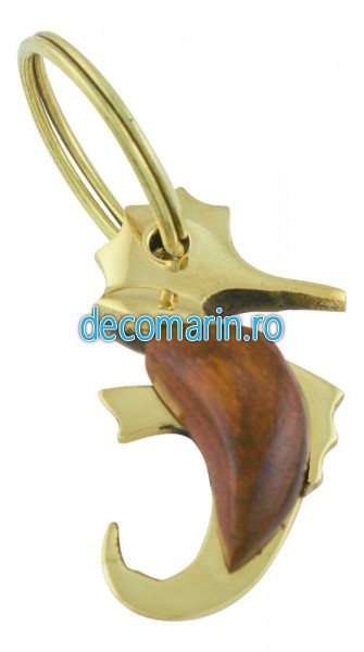 breloc din alama/lemn cu tema marina, model cu calut de mare