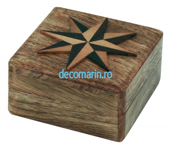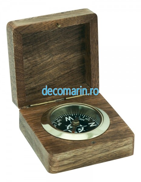 Busola din alama in cutie din lemn de mango si capac cu roza vanturilor