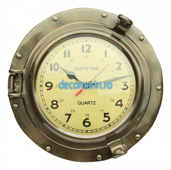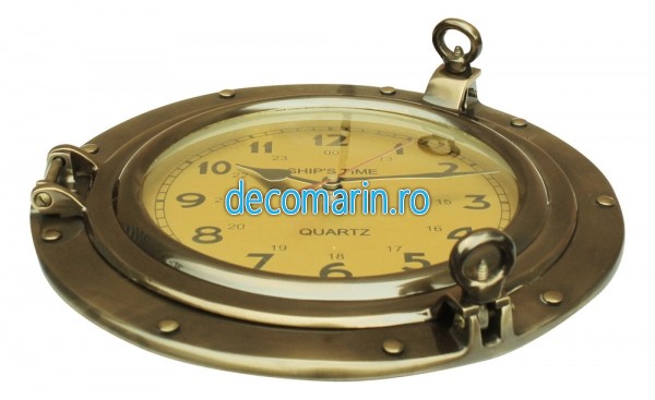 Ceas de perete in suport tip hublou din alama antichizata