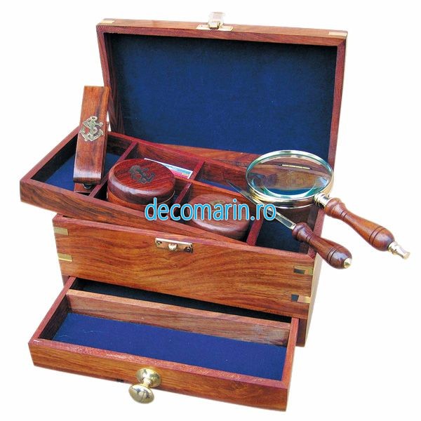 ruleta, ascutitoare cu capac, cutit de scrisori, lupa si capsator /cutie cu capse inclusiv