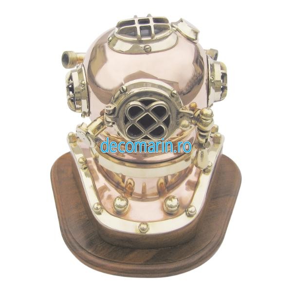 Casca de scafandru decorativa din alama si arama, suport din lemn