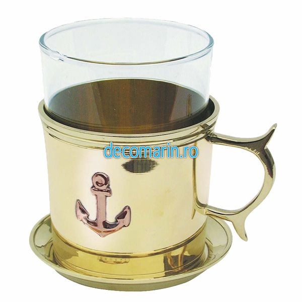 cana/pahar din sticla termorezistenta si suport/protectie de alama lustruita, model cu ancora gravata