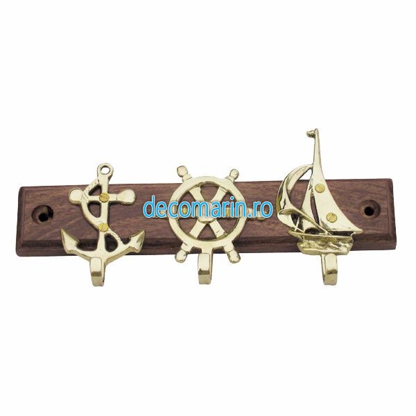 cuier mural din alama pe suport din lemn, model cu 3 agatatori cu tema marina