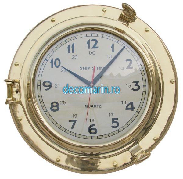 ceas din alama in suport tip hublou, cadran cu cifre arabe, alimentare cu baterie