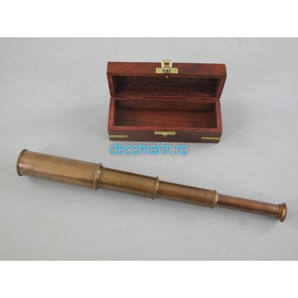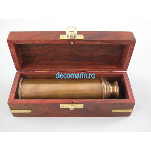 /telescop din alama invechita in cutie de lemn