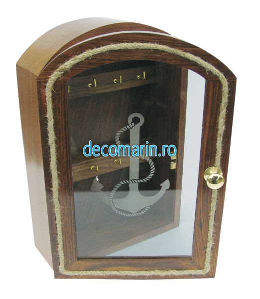 cutie din lemn pentru chei cu tema marina,capac din sticla ,design cu ancora si franghie decorativa pe usa din fata